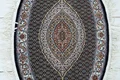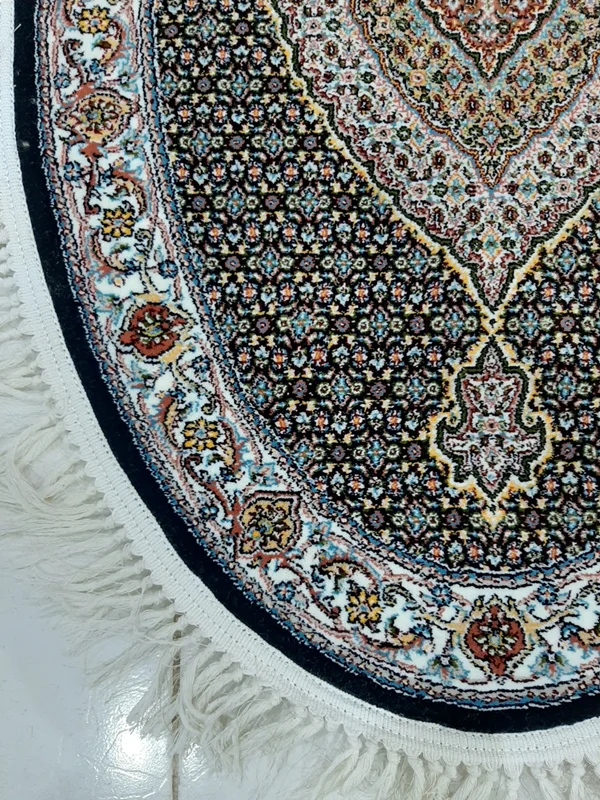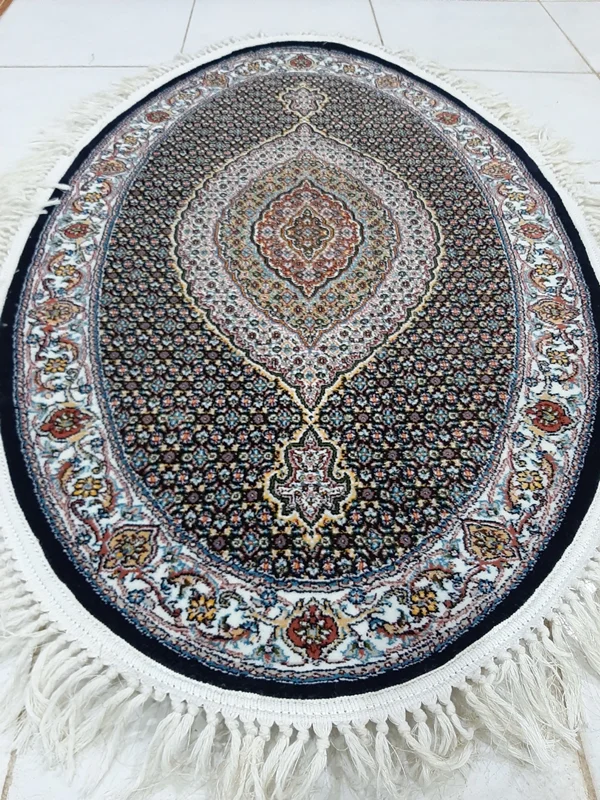 قالیچه بیضی فرش ماشینی یک متر در 1/5 متر بیضی 700 شانه اصل ریزماهی سرمه ای با تراکم 2100 صددرصد نخ اکرولیک هیت ست شده با 60 ماه ضمانت کیفیت، ارسال پس کرایه