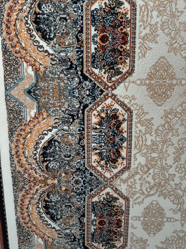 فرش ماشینی ۷۰۰ شانه اصل نقشه هالیدی کرم هشت رنگ صددرصد نخ اکریلیک هیت ست شده با ۶۰ ماه ضمانت کیفیت و ضمانت مرجوعی کیفیت، بسیار باکیفیت، با ضمانت اتوی داغ، بافت با ۳ رنگ متنوع زمینه، فیلی - سرمه ای- کرم، ارسال پس کرایه